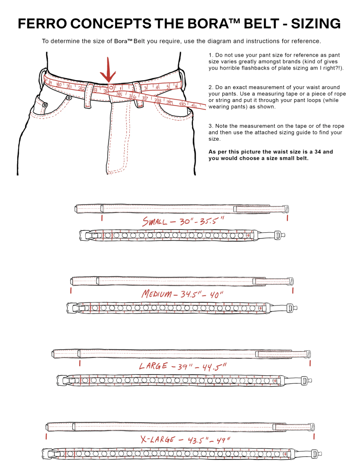 ATTENTION: Please refer to the sizing guide as this belt is sized for your waist, not your pants size. **BORA BELTS ARE A PART OF OUR APPAREL TERMS AND CONDITIONS** **MAKE SURE YOU ORDER THE CORRECT SIZE AS THESE ARE NOT RETURNABLE / REFUNDABLE WITHOUT A RESTOCKING FEE OF 25%**