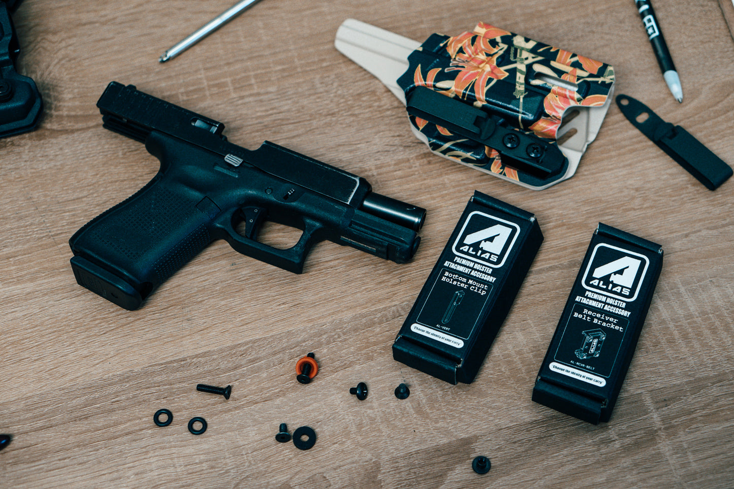The NeoMag Alias bottom mount holster clip replaces other plastic or metal bottom mount/vertical holster clips that require 2 screws. The slot in the aluminum bar allows for an incredible amount of ride height adjustment and rigidity. The bottom mount clip has the ability to allow you to tuck your shirt in when carrying and does not have a visible holster clip.