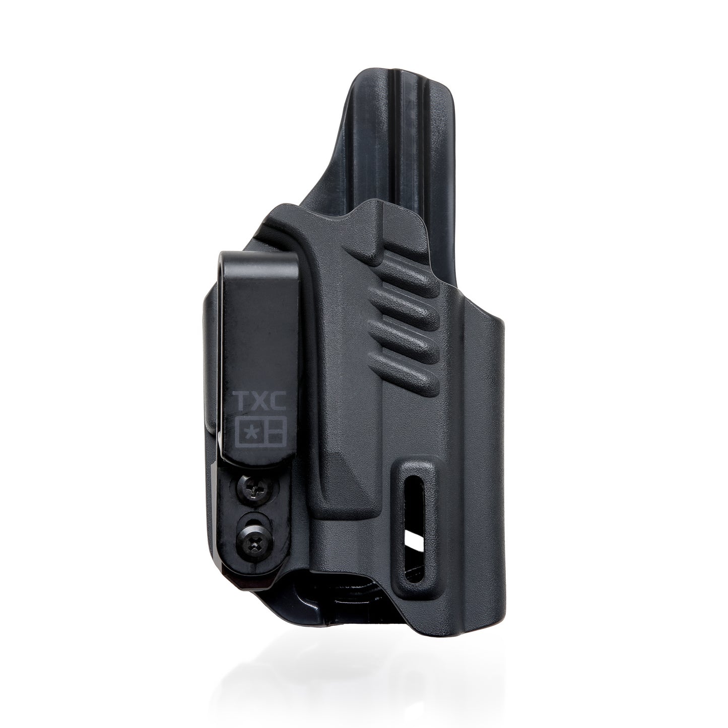 - As with all TXC holsters, each holster is cut to accommodate suppressor height sights* and optics by default. Each is also open-ended to allow the use of threaded barrels and most compensators.