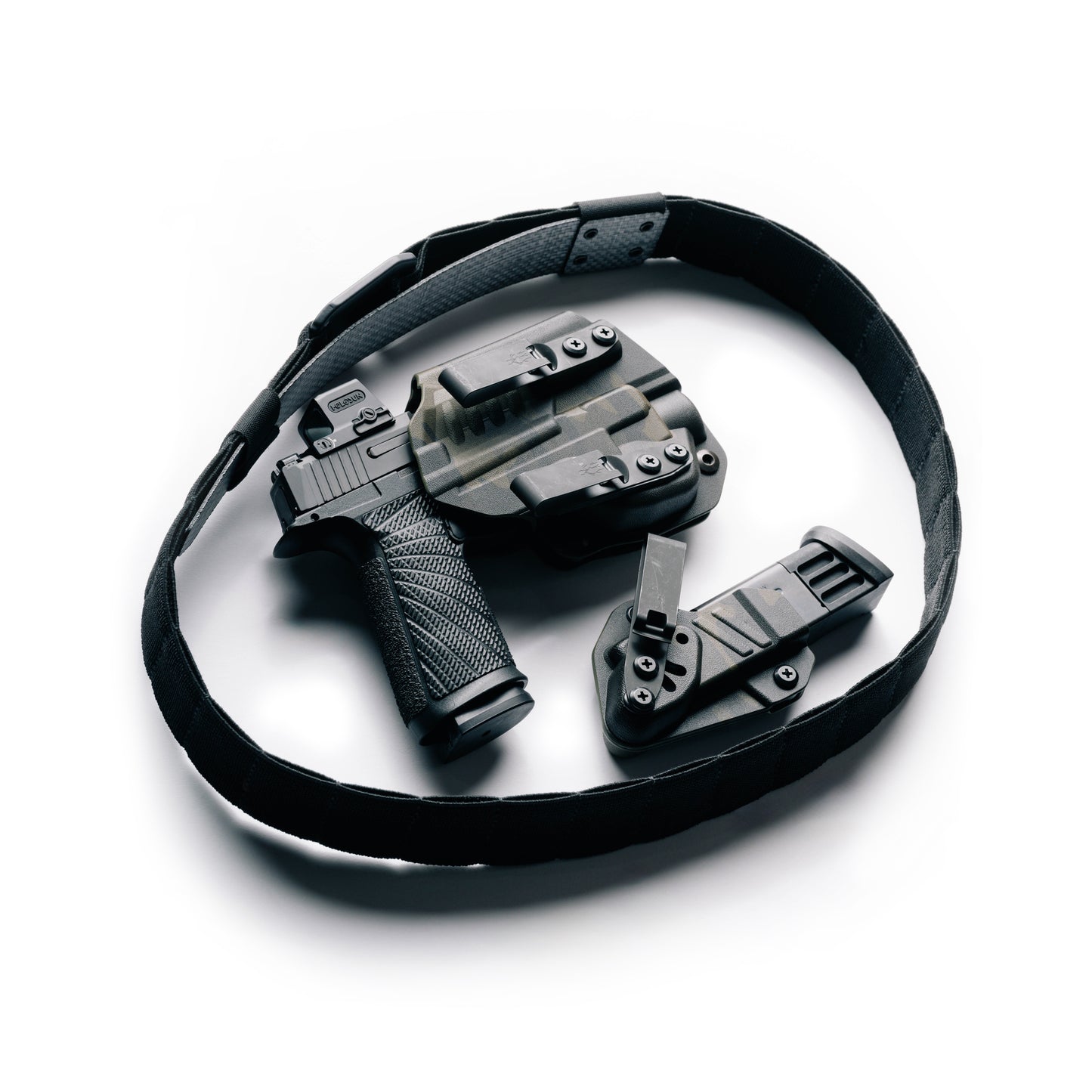 The Every Day Belt (EDB). This one size fits most 1.5 inch wide belt comes with 45 inches of high-strength stretch material, and a glass-filled nylon-composite buckle to match. Designed to make carrying your firearm and accessories comfortable, it fits most every body type. It also comes with our detachable placard system enabling you to attach your clips behind the belt to limit any exposure of your equipment. Simply measure the belt around your waist, give yourself a few extra slots (we recommend 2-3ish), cut and burn the ends so you don't get any fraying. Oh, and those 1.25 inch slots all the way around... yes, you can hide things in there too. USB drives, handcuff keys, and Kevlar string to name a few.